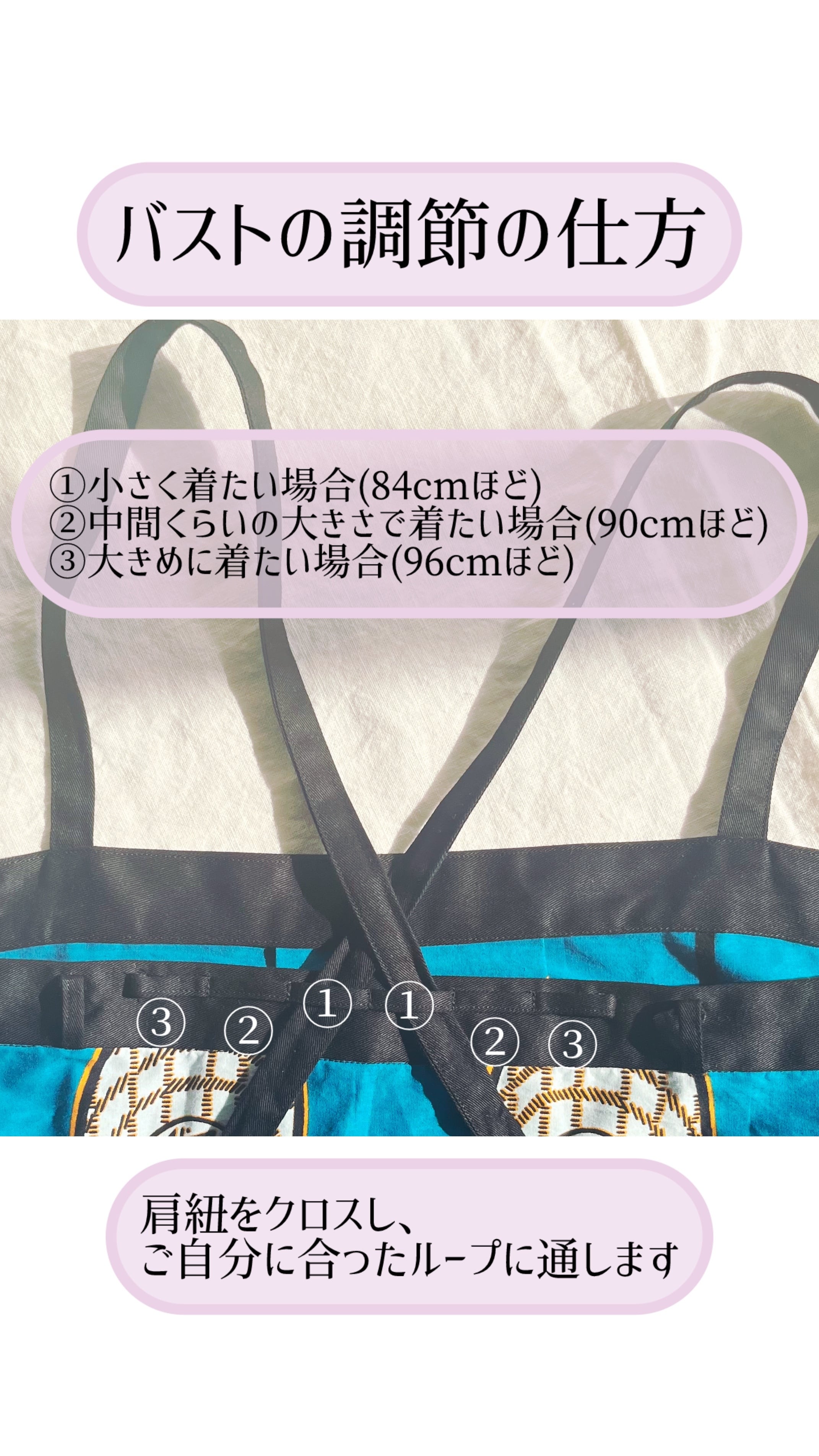 着方、調節の仕方は最後の4枚の写真でご紹介しております。(柄の違うサンプルを使用した写真です)